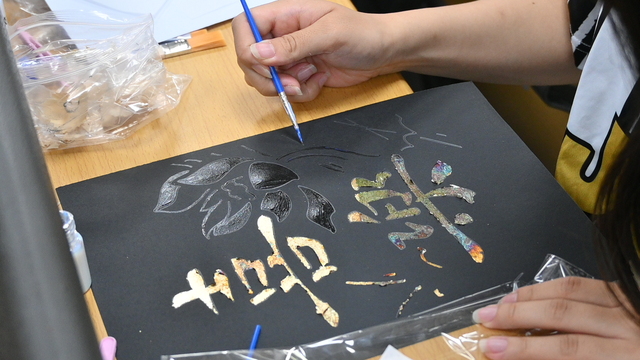 文化体验课上,上海外国语大学孔子学院工作处的项晨辰老师现场教授传统烧箔画制作。学生们小心翼翼地用镊子将金箔在特制胶面上拼贴,创作出“龙”、“凤凰”、“年年有鱼”、“福”字和“柿柿如意”等富有中华文化寓意的精美作品。项晨辰老师解释道:这些传统图案不仅美观,更承载着中国人对美好生活的向往。比如“柿柿如意”谐音“事事如意”,“年年有余”则寓意富足安康。日本团组的营员们在动手实践中,不仅领略了中国传统工艺的精妙,更深刻理解了这些图案背后的文化内涵。
