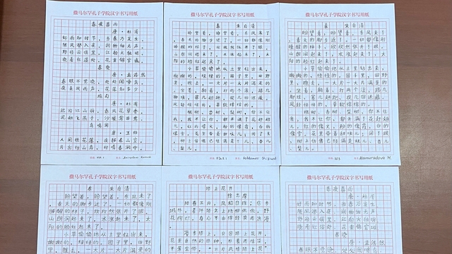 比赛采取硬笔书写的形式,以班级为单位分别进行。孔院统一发放标准书写用纸,书写内容为描写春天的中文诗词、名篇名句。在孔院教师向各自班级的学生讲解了汉字书写规范和书写内容后,学生们开始端正坐姿,调整握笔姿势,态度严谨地进行书写。《春晓》《春夜喜雨》《钱塘湖春行》《春》《陌上花开》等经典作品,在同学们一笔一划的书写中跃然纸上。值得一提的是,仅学习了一个多月汉语的孔院零起点班学员也参加了比赛,并准确、规范、美观地完成了书写。