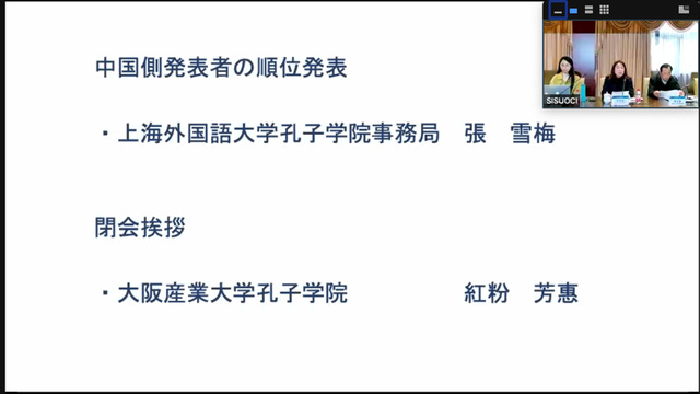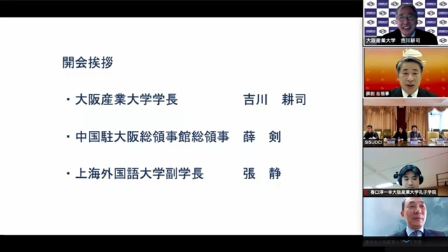 开幕式上,大阪产业大学校长吉川耕司首先致辞,他对上海外国语大学、中国驻大阪总领事馆一直以来给予的大力支持表达诚挚谢意,并对参加此次论坛的专家学者和研究生们表示热烈欢迎。中国驻大阪总领事馆薛剑总领事在致辞中强调,在纪念中日邦交正常化50周年、北京冬奥会即将举办的大背景下举办此次论坛具有重大意义,希望上海外国语大学与大阪产业大学今后能以孔子学院为纽带,继续拓展交流合作领域,为新时代中日两国之间的人文交流,尤其是青少年之间的友好交流贡献积极力量。上海外国语大学张静副校长则在致辞中肯定了大阪产业大学孔子学院建院十多年来,围绕服务日本社会对中文人才的需求、服务中日两国人民之间的友好交流所开展的各项工作,相信本次活动不仅能提高学生们的学术研究水平,同时也能丰富中日青年学生以及中日高校之间的学术交流形式,助力上外和产大两校的学科建设与发展。