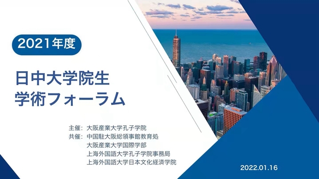 当地时间2022年1月16日,大阪产业大学孔子学院“第五届中日研究生学术论坛”在线上举办。此次论坛由大阪产业大学孔子学院主办,中国驻大阪总领事馆教育处、上海外国语大学孔子学院工作处、上海外国语大学日本文化经济学院及大阪产业大学国际学部协办。