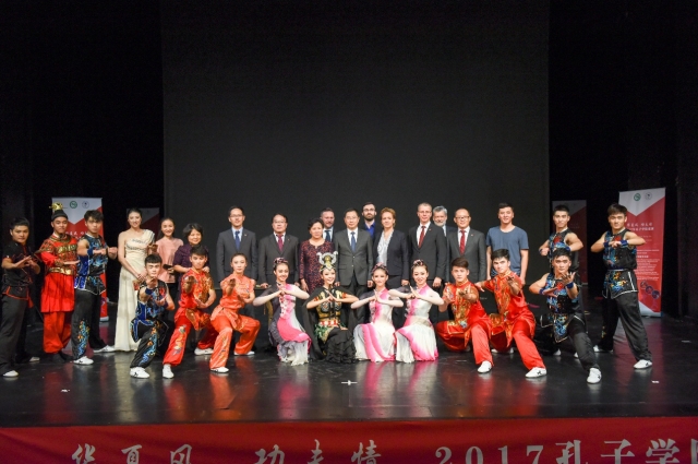在庆典活动的文艺演出部分,孔院哈萨克族汉语教师志愿者为大家表演了独舞《天鹅》,她用曼妙的舞姿配上具有民族特色的音乐很好地展现了中国少数民族的文化魅力。来自赛格德当地舞蹈团表演了节奏明快、具有匈牙利特色的舞蹈。之后,来自首都体育学院的艺术团则带来“华夏风、功夫情”2017孔子学院巡演节目,以时间为节点用九个环节生动展现了中国武术从远古时代的起源到现在所积累起来的中国优秀武术文化。整个演出充满了浓郁的中国风,精彩纷呈,具有非常高的艺术欣赏性,赢得了现场观众的阵阵掌声,也将整个庆典活动的气氛推向了高潮。