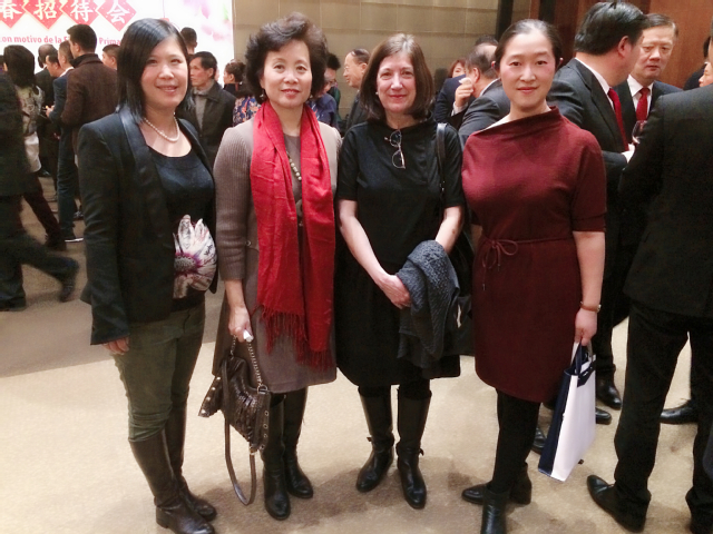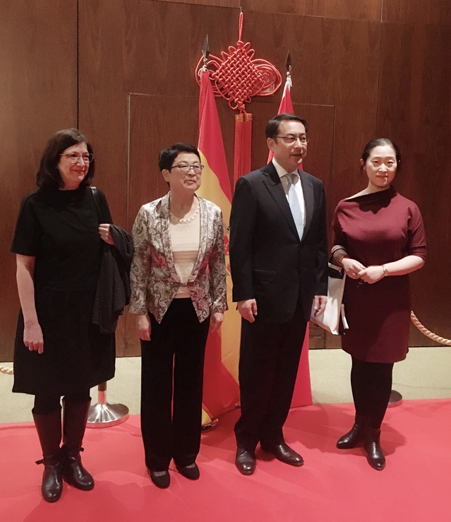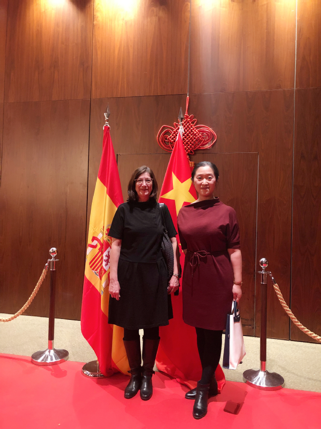 招待会上,中方院长陈旦娜与上海外国语大学校友,西班牙中国会副会长李娅女士互道祝福。李娅女士现任西班牙毕马威中国业务部的高级经理,致力于协助中资企业在西班牙的投资并购以及在西中资企业的顺利发展。同窗好友自上外西方语系毕业后在各自岗位上为中国的腾飞贡献力量,此次在马德里相遇倍感亲切。