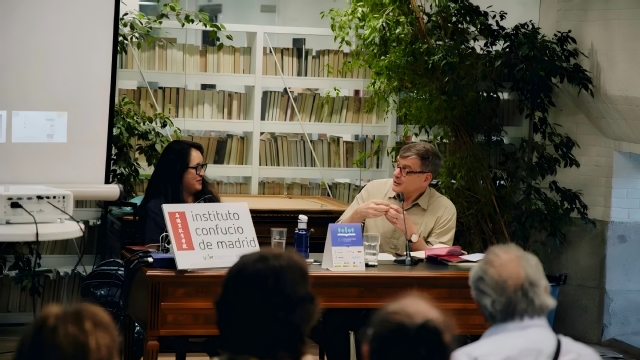 当地时间2025年6月2日,西班牙马德里孔子学院在丽池公园市立图书馆(Biblioteca Eugenio Trías)举办了第二十五场“阅读中国”读书会。本次活动首次与马德里中国文化中心“悦读中国”栏目合作,并作为第84届马德里书展的系列活动之一,吸引了众多文学爱好者的参与。读书会围绕藏族作家万玛才旦的《气球与塔洛》(Globo y Tharlo)西语译本展开讨论,由马德里孔子学院外方院长杨德(Andreas Janousch)主持,中方院长陆恺甜出席,该书西班牙语译者莫沫(Isolda Morillo)主讲。