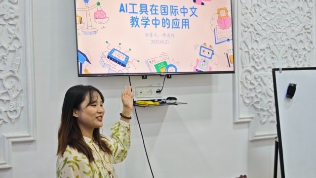 国际中文教育志愿者傅美玲以《AI工具在国际中文教学中的应用》为主题,重点探讨了如何将ChatGPT、Deepseek等AI工具融入备课、课堂互动、作业设计及个性化辅导等环节,演示了具体操作流程,激发了教师们利用技术提升教学效率与趣味性的热情。