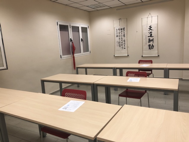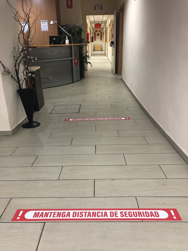 由于当地民众强烈要求以面授方式学习汉语,在综合评定马德里疫情发展情况后,马德里孔院决定在暑期开设少量零起点面授班,同时恢复部分现场办公,接待课程咨询。为此,中外方院长多次与马德里自治大学进行协商,提交申请,根据要求在孔院内配备挡板、消毒用具、粘贴隔离线和卫生提醒,制定员工防疫守则,发放防疫用品,并聘请有资质的卫生检疫公司在孔院开放前检查学院的防疫准备工作,获得允许后恢复开放。