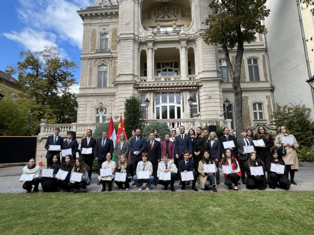 赛大孔院推荐的玲娜(Zsoldos Dorina)、林安思(Láda Fanni ALEXANDRA)、碧卡(Fehér Bianka)、米兰(Rigó Milán István)、妮可(Székely Nikolett)五位孔院学员荣获2025年度“中国大使奖学金”,另有九位学员获鼓励奖。