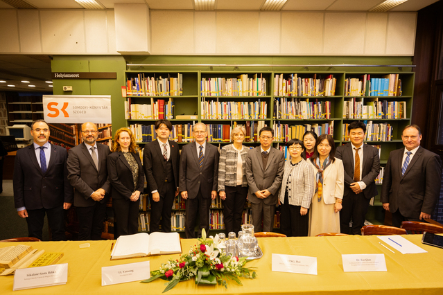 当地时间2025年10月10日,上海外国语大学校长李岩松率团访问匈牙利赛格德大学孔子学院,并出席在琼格拉德州州立索默其(Somogyi)图书馆举行的赠书仪式。仪式在图书馆三楼阅览室举行,由馆长Sikaláné Sánta Ildikó主持。仪式伊始,Ildikó向嘉宾介绍了市立图书馆的历史沿革与文化特色,Kozma József则对到场的中匈嘉宾表示了欢迎。李岩松对赛格德大学孔子学院及市立图书馆在促进中匈文化交流方面所作的努力表示高度赞赏。随后,李岩松和赛大孔院中方院长陶茜签署了赠书证书,上外代表团和参会嘉宾合影留念,定格下中匈文化交流的重要时刻。