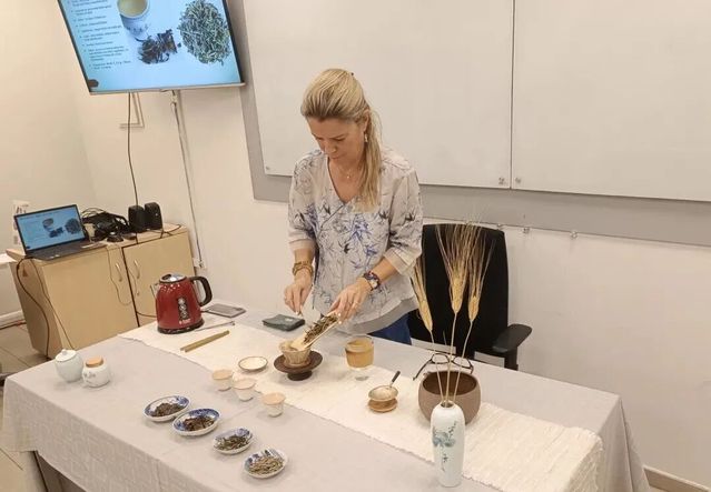 活动开始,谢歌文为大家介绍了茶树的生物学定义,并概述了中国主要茶区的种植情况以及茶叶的分类与产地。随后,她讲解了泡茶过程中水温与水质的重要性,并亲自示范了“眼观、鼻嗅、口尝”的品茶三步法。