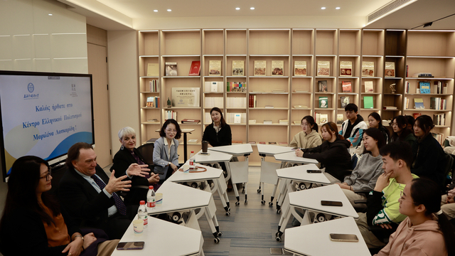 北京时间11月5日,希腊亚里士多德大学(以下简称“亚大”)副校长尼古拉斯·马焦里奥斯(Nikolaos Maggioros)、希腊亚里士多德大学孔子学院(以下简称“孔院”)希方院长罗兰(Roula Tsokalidou)与中方院长王少娣一行,在上海外国语大学(以下简称“上外”)希腊语系主任胡晶晶的邀请下,与希腊语系全体师生开展了一场交流座谈。