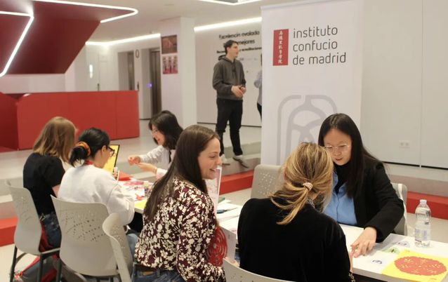 展会现场,马德里孔子学院教师马玥、张菁带来了中国剪纸和汉字文化体验活动,许多学生首次尝试剪纸及甲骨文对对碰游戏,在轻松体验中感受了中国语言与艺术。孔院展台还吸引了众多学生和家长咨询中文课程、赴华留学途径及奖学金信息。