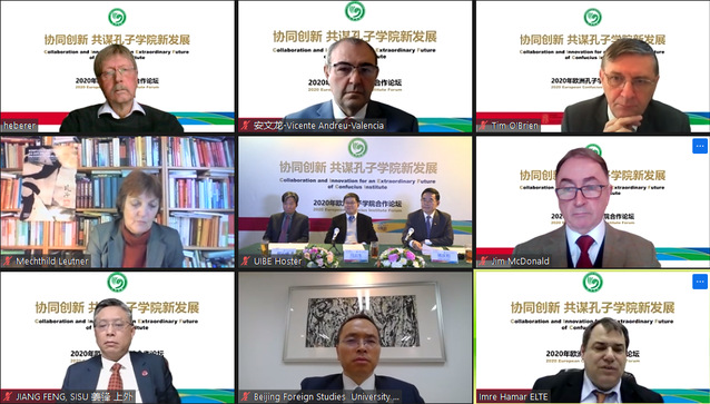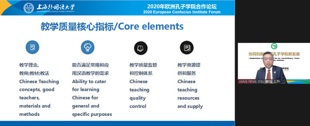 2020年12月17日晚,2020年欧洲孔子学院合作论坛在线召开。论坛由中国国际中文教育基金会主办,上海外国语大学、对外经济贸易大学、英国斯特莱斯克莱德大学、北京外国语大学、匈牙利罗兰大学等多家中外高校代表参加论坛。校党委书记姜锋出席并做题为“科学评估孔子学院办学质量”的主旨发言。