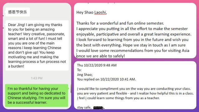 比如转为线上教学后,我根据班上学生的接受能力放慢了教学进度,设计多种活动,利用几个线上平台,让学生通过听、说、读、写反复操练;给能力较强的同学推荐汉语学习APP,用电子邮件、微信等工具增加课后交流,甚至应学生要求帮助寻找合适的课外辅导等;对学生提出来的问题,也会在接下来的课中解答并设计针对性的练习,等等。