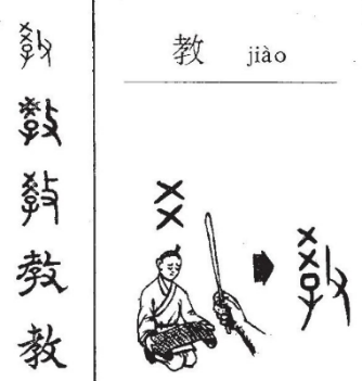 就拿汉字教学来说,我们的课程安排第二个层次开始认读汉字。通常对一些还保留字源字形的现代汉字,我会向学生们展示并解释对应的甲骨文、金文字符。如“教”的甲骨文,左上方的“爻”是表音符,左下是一个孩子,右边是手持教鞭的象形符。拆解汉字结构、介绍字源不但可以帮助学生记忆,而且也正好让学生了解中国传统的教育理念和师道尊严的传统礼教。