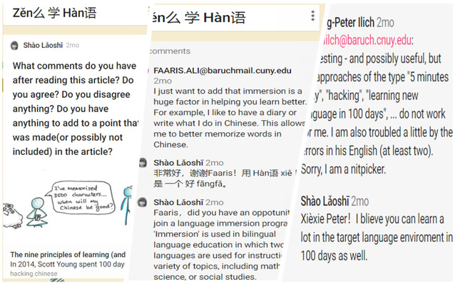 在学期中讲到一篇讨论怎样学习汉语的课文,我借机让同学们分享自己学习汉语的方法,还在Padlet上介绍了一篇关于成功的汉语学习者学习汉语的九大诀窍的文章,同时让学生分享对这篇文章的看法并反思自己的学习方法。有时候同学间的相互交流,学生的自我反思,比教师向学生灌输理念和方法更易接受、更为有效。下图截取了学生在Padlet上阅读《学习汉语的9个诀窍》后做出的反思。