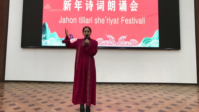 接着,孔院学员朗诵了苏轼的《水调歌头》,以和谐的音律和优美的节奏带观众感受了诗人的豪迈感情和开阔胸怀;学员Zarnigor朗诵了乌译中诗歌《伟大啊,我的祖国》,他时而慷慨豪迈、时而温婉悠扬,语调中饱含对祖国深深的眷恋和浓浓的热爱;Mazvzuna学员朗诵的《蒹葭》充满深情、娓娓道来,让大家感受到了中国古典诗词的独特魅力。