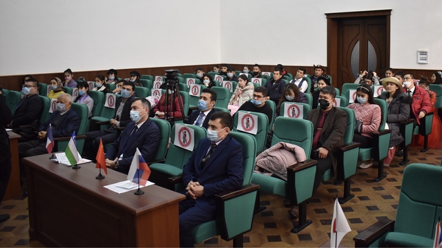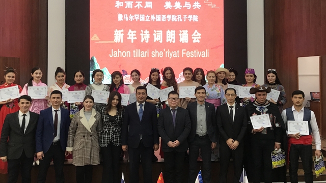 当地时间2020年12月24日,撒马尔罕国立外国语学院孔子学院举办“和而不同,美美与共”新年诗词朗诵会。因疫情原因,活动采取了线上线下相结合的形式,撒外校长图赫塔西诺夫、副校长盖卜拉耶夫和阿舒洛夫、各院系负责人、撒外孔院乌方院长萨法洛夫等到现场参加活动,撒马尔罕国立外国语学院和孔院的其他师生通过网络直播观看了朗诵会。当地主流媒体STV(撒马尔罕电视台)到现场对朗诵会进行了采访录制。