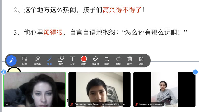 以我个人为例,在“转战线上”的前期,无论我还是我的学生都出现了或多或少的不适应,没有了书本、马克笔,取而代之的是屏幕和屏幕后与学生之间的距离感。而学生少了现实课堂中身边的那种共习氛围,他们需要有更强烈的自我管理意识。虽然线上教学的前期出现了这样那样的问题,但这也是熟悉与适应的必要阶段,经过一段时间的适应以及对教学软件的发掘,我与学生在教学软件中发现了许多传统课堂无法做到的一些优点。首先线上教学不受空间的限制,无论你在哪儿,只要有网络和手机或电脑就可以在线实时上课,比如在我的汉语班中除了撒马尔罕本地的学生还有在首都塔什干生活的学生,从这点来看,线上教学避开了传统教学中固定地点的麻烦,这可使招生对象不再受城市地域的限制,同理在乌兹别克斯坦尚未设立汉语教学点的城市,我们同样可以运用线上教学的方式开展汉语教学,这也为未来的招生方向打开了新思路。