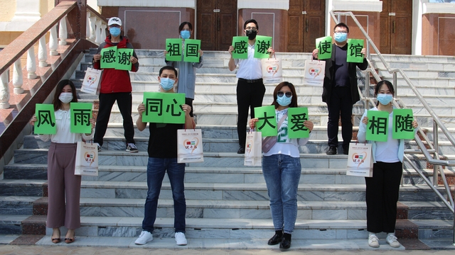 在乌兹别克斯坦出现疫情后,驻乌大使馆、语合中心、上外孔院工作处都第一时间做出反应,积极询问撒外孔院教师的身体状况,并为我们陆续发放了健康包、口罩、药品乃至米面粮油等抗疫物资。这一份又一份的关怀,让身处异国的我们感受到祖国母亲最热切的惦念,更让我们感受到“我不是一个人在战斗”!就像大使馆发放的健康包上的那句:“丝路相连,同舟共济!”