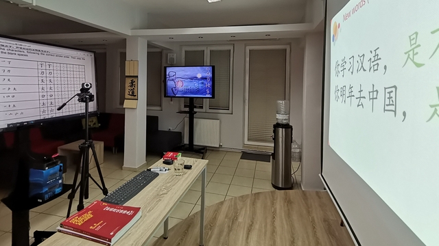 疫情爆发后,孔院的课程全部转到了线上。为了最大限度地改善学生们的网课体验,孔院认真策划,采取了一种全新的“实景直播课堂”模式。通常,教师在线授课的做法是坐在电脑旁,在授课平台共享课件、讲解内容并与学生实时互动,但是,亚里士多德大学孔院的教师则是在实景教室内像平时一样站立授课。