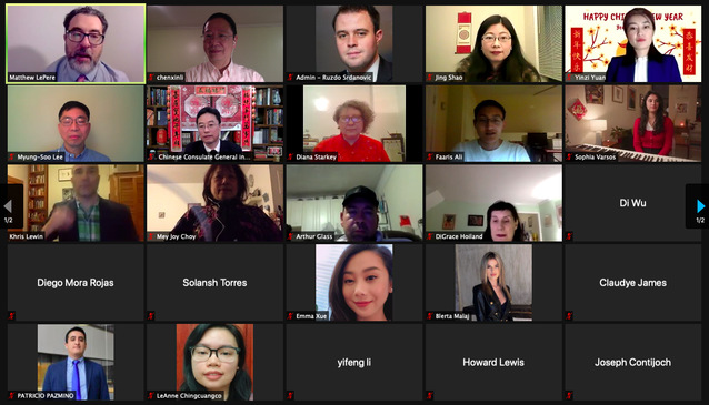 当地时间2021年2月16日,纽约巴鲁克国际金融孔子学院与上海外国语大学孔子学院工作处和艺术教育中心共同举办“风韵中华”云上春节晚会,迎接中国春节的到来。来自美洲地区兄弟孔院的院长们及巴鲁克学院的师生共50余人参加了此次晚会。