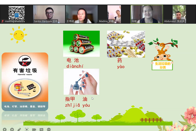 接着老师聚焦“魔都”上海,向学员们介绍上海生活的一大“特色”——垃圾分类。老师以图片的形式展示了生活中常见的四种垃圾,并教学员们如何对它们进行分类。在垃圾分类的趣味活动中,曾在上海有留学经历的玲珑(DILSHODA)学员积极回答,并表示在上海生活时,垃圾分类是有趣且有意义的事。