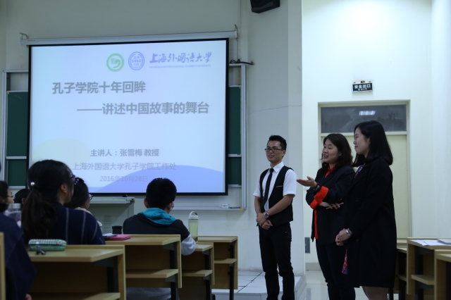 2016年10月28日,一场名为“孔子学院十年回眸——讲述中国故事的舞台”的讲座在松江校区第三教学楼357教室举行。上外孔子学院工作处处长张雪梅教授为来自汉语国际教育、英语、俄语、德语、韩语、瑞典语、公共关系和中国现当代文学等专业的本科生和研究生全方位解读孔子学院的定位、我校海外孔子学院建设十周年的历程。我校优秀归国汉语教师志愿者代表孙亿灵和肖志魁也来到讲座现场,与学弟学妹们分享在孔子学院工作、生活的经历和感受。