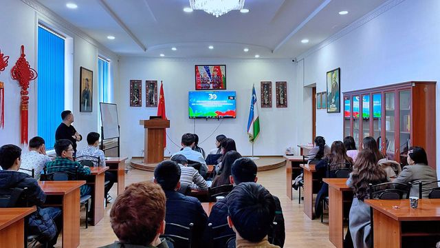 3月18日,中国驻乌使馆和乌外交部举办庆祝中乌建交30周年线上招待会暨音乐会,中国驻乌大使姜岩和乌国各界嘉宾线上出席并致辞,孔院组织师生在图书馆集体观看线上演出。会上播放了“春之路——庆祝中国和乌兹别克斯坦建交30周年”云端文艺演出片段,中乌艺术家联袂呈现了唐乐舞、皮影戏、交响乐、木卡姆等中乌经典节目,让师生们大饱眼福,大家纷纷表示此次演出是节日期间的一场视听盛宴,祝愿中乌友谊进一步发展。