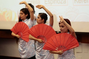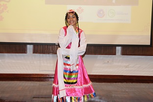 孔子学院不光老师多才多艺,学生也是人才辈出。由Estela等四名学生表演的扇子舞,将中国流行音乐《霍元甲》与中国传统舞蹈结合在一起,引得全场掌声不断。接着是汉语桥获奖学生Camila飞扬的藏族舞表演,美丽的服饰,空旷的音乐,曼妙的舞姿,让人看得如痴如醉。