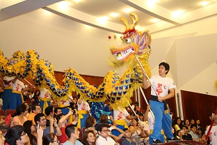 此次春节联欢会不仅有精彩的歌舞表演,而且还有激动人心的抽奖环节。两位院长分别上台抽取幸运观众,送上富有中国特色的小礼物,也送上最真挚的新年祝福。幸运观众收到了新年礼物,其他的观众也没有空手而归,跟着主持人学说中国吉祥话“鸡年大吉”,而且还品尝到了孔院精心准备的中国美食,真真切切地过了一回中国年。