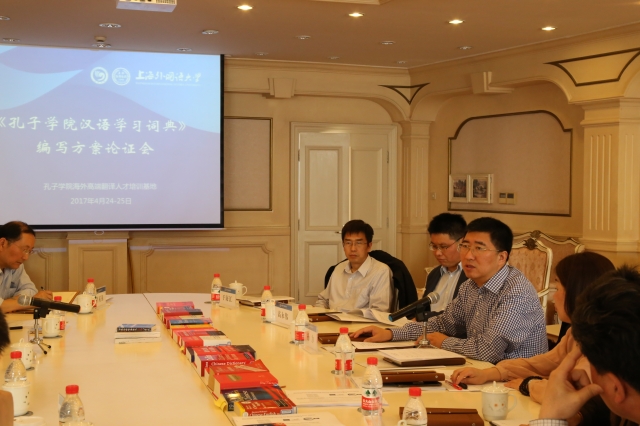 2017年4月24日下午,上海外国语大学孔子学院海外高端翻译人才培训基地《孔子学院汉语学习词典》编写方案论证会在上海外国语大学会议中心召开。