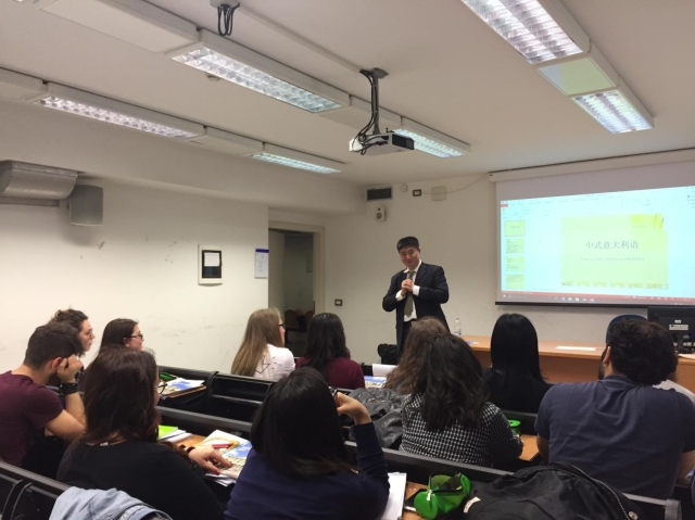 张艳莉教授在意大利本土教师汉语课上讲授了汉语测试的相关内容。在张教授的讲解中,各位意大利本土教师了解到目前在中国采用的汉语测试方法以及其中所包含的科学性和准确性;还明白了在汉语教学中需要思考测试方法,同时利用测试的反拨效应来促进汉语教学。缪博士在本次授课上就汉语教学法领域的动态与学生进行了研讨。缪博士还专门在孔院开设的基础汉语(四级)班上向学员介绍了上海外国语大学的情况。他还向学生介绍了上外国际交流学院开设的丰富多彩的汉语课程,包括精读课、听力课、口语课、报刊阅读课以及太极、剪纸等文化类的课程。缪博士还特别介绍了非常受留学生欢迎的“汉语角”活动。学员们听了缪老师的介绍,纷纷表示对上外非常感兴趣,并表达了留学上外的强烈愿望。