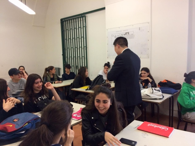 缪博士还与意大利那不勒斯东方大学孔子学院中方院长徐海铭教授一同参观了孔院下设的Fonseca孔子课堂,与初级和中级班的意大利高中生进行了互动。缪博士向学生们介绍了上外汉语夏令营项目。他从自己多年教学经验的角度提出了学习汉语的建议,并鼓励学生积极参与汉语课堂、开口练习。他强调汉语夏令营对汉语水平提高有显著作用。徐教授和缪博士与该课堂的中意双方教师以及全体学生合影留念。