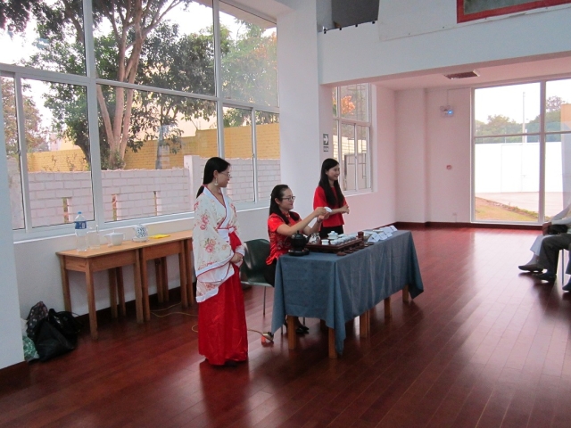 中秘友谊馆的场馆内,身穿中国民族传统服饰的孔子学院教师们则为当地居民准备了三场茶艺展示活动。让当地居民健身之余,共享中国名茶的清醇与甘美,共同领略中国源远流长的茶文化。
