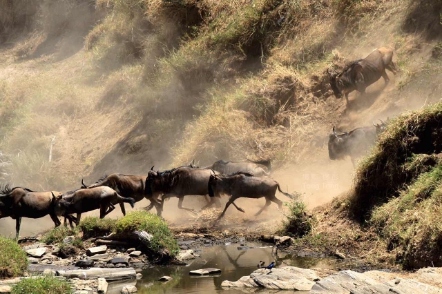 我们赶紧追了过去,引入眼帘的是,成千上万的角马,浩浩荡荡,一路狂奔,天国之渡,生死攸关,那条主宰生死的马拉河,呜咽着,咆哮着,又宽又长,水流湍急,危机重重,渡河的角马,要不老鹰在天空盘旋,狮子在远方吼叫,水里的河马不时发出呜呜的可怕的叫声。领头的角马果敢的决策力,先锋部队的视死如归,毫不畏惧,紧紧尾随的角马,毫不犹豫纵身一跃,下饺子般跳进了生死马拉河。整个渡河持续了将近一个小时,发疯似的角马,鸣叫者,你追我赶,相互簇拥,调皮的斑马也混进了角马的队伍,来一次漂亮的小马过河。面对这排山倒海的阵势,河里的鳄鱼和河马,一定被震撼到了。