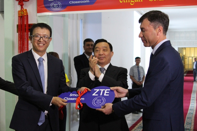 接下来,王晨副委员长出席了中兴通讯(ZTE)智慧教室捐赠仪式。在王晨副委员长见证下,中兴通讯乌兹别克斯坦子公司CEO毕鹏松将智慧教室的象征性钥匙移交给撒马尔罕国立外国语学院校长图赫塔西诺夫。王晨副委员长一行参观了智慧教室,饶有兴致地观看了孔院教师彭鑫葛以“一带一路国际合作高峰论坛”为主题的公开示范课。