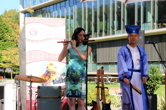 悠扬的竹笛独奏与优美的宋词朗诵为本次表演拉开了序幕。随后六位汉语教师志愿者进行了精彩的太极表演。公园里的学生纷纷被这场“太极秀”吸引,驻足观看。表演结束后,学生报以热烈的掌声。