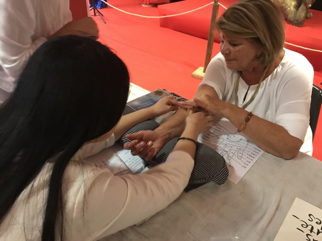 那不勒斯东方大学孔院教师和志愿者教师们精心准备此次“东方节”,每天都安排了丰富的文化体验活动。9月15日,孔院志愿者张曼莉老师在现场支起了“中医问诊台”,免费为市民朋友把脉。当地民众对于中医非常好奇,不一会就在展台前排起长长的队伍,等候号脉。同时,孔院也免费提供了意大利语版的中医养生杂志,孔院教师也和大家分享一些日常养生方法。