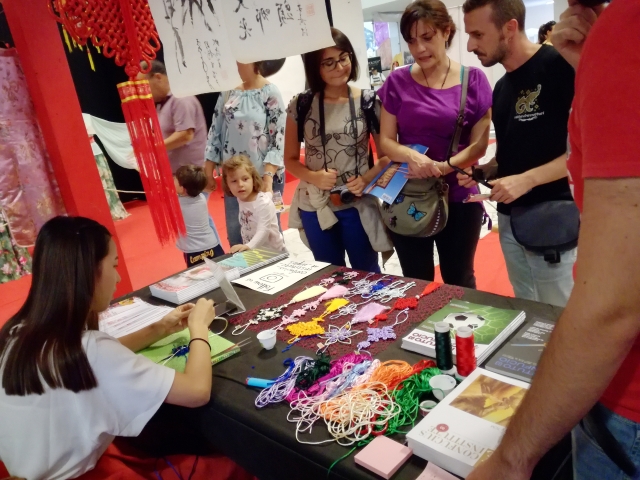 当天,孔院教师们还表演了另一门中华才艺——中国结。在以往,意大利人心目中的中国结是红色的、方正的。而在“东方节”上,孔院孙嘉莉老师现场编出了各种各样的中国结,承载着一帆风顺、富贵花开、四季如意等等美好的寓意。孔院教师在现场为来参观的人们定制属于自己的中国结。中国结虽小,但确承载着来自东方国度的深深祝福。