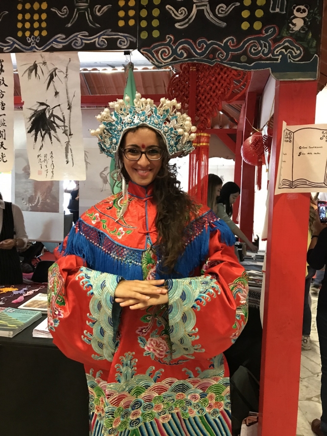 “东方节”为期六天,分别在9月15日-17日和9月22日-24日进行。在整个展区中,那不勒斯东方大学孔院展台显得尤为特别:展台外形为古色古香的江南亭子,外檐垂挂着宫灯、中国结,内部悬挂着各式中国传统服饰和孔院学生的书法作品。