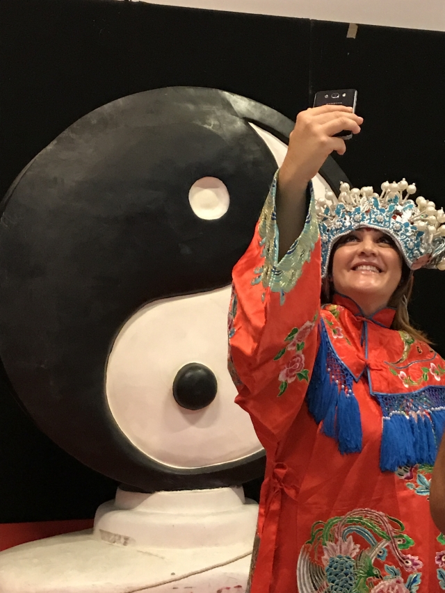 最后一天是人流小高峰。孔院教师们准备了皮影戏、传统服装试穿等活动。皮影戏吸引了很多意大利小朋友的注意力,在孔院教师的鼓励与指导下,不少小朋友尝试着操控自己的影人,伴着现场的唱段表演。传统服装试穿是当天最受欢迎的活动。不少金发碧眼的意大利人穿上中国古典服饰、戴上头饰,拿捏中国传统手势或者拿一把扇子,变身成闺阁小姐或风流才子的模样。展区中的亭子、太极图、兵马俑都是合影留念的最佳背景,广受欢迎。