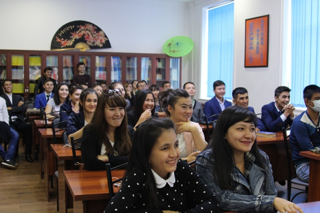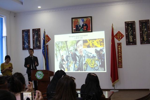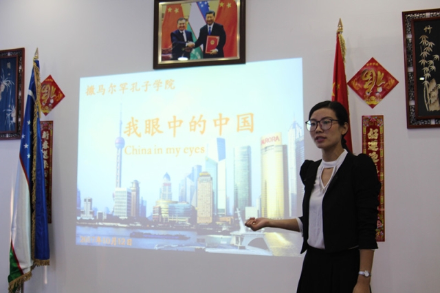 10月12日下午,撒马尔罕国立外国语学院孔子学院举办了“我眼中的中国” 孔院奖学金生交流会。获得孔院奖学金、在中国学习一年归来的三位同学分享了他们的留学经历和见闻。他们分别是在上海外国语大学学习的李阳阳(KHURSHIDJON KUZIEV),在西南大学学习的王丽芳(GULJAKHON NURITDINOVA)和在山东师范大学学习的李庆庆(ABDURASUL TUKHTAMISHEV)。