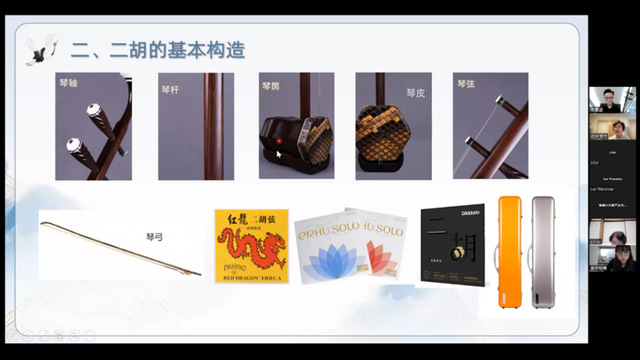 讲座最后,日本学员积极提问,周墨涵老师不仅一一耐心回答,还时不时提起手上的二胡,靠近摄像头,进行细节展示。学员安井结香表达了自己一家人对二胡的喜爱之情,表示在吃中餐的时候,他们家里总喜欢配上一段二胡曲来烘托气氛。在学员的感谢声中,讲座圆满地落下了帷幕。