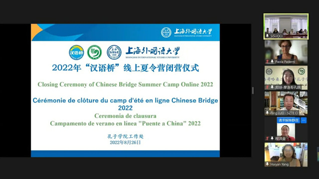 2022年8 月 26 日下午,上海外国语大学2022 年意大利等五国团组“汉语桥”线上夏令营闭营仪式在上外虹口校区举行。上海外国语大学孔子学院工作处处长张雪梅、国际文化交流学院副院长鹿钦佞,上外合建孔院、克罗地亚萨格勒布大学孔院中外方院长,以及来自摩洛哥、西班牙、匈牙利、克罗地亚、意大利的200余名学员等参与。