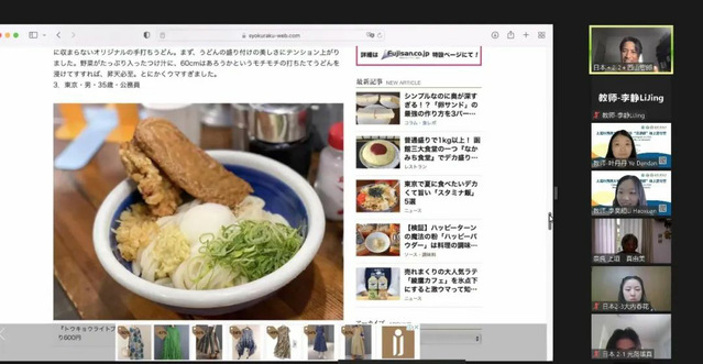 看到日本学员如此积极的发言,叶丹丹老师也禁不住向大家分享了中国的美食:广式煲仔饭、重庆火锅、陕西油泼面、南京鸭血粉丝汤、北京烤鸭、上海小笼包等等,琳琅满目的中国美食吸引了学员们的目光。随后,西山哲郎同学展示了日本一家“中华美食”。虽然其名为“中华美食”,但无论是风格还是式样都与中国本土的中国菜区别较大,老师和学员们都感到十分有趣。