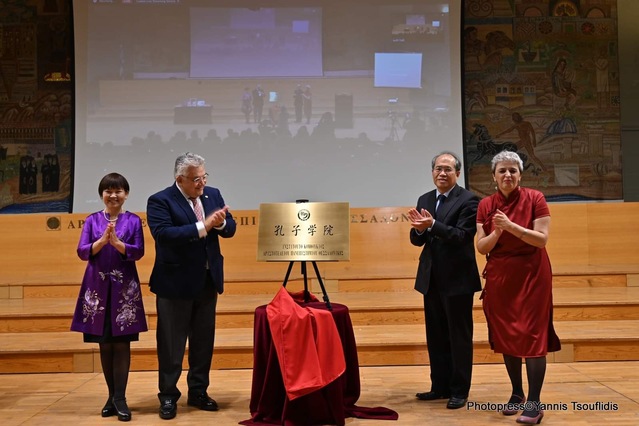 仪式上,肖军正大使、尼古拉斯帕帕约阿努校长、罗兰和鲍晓英院长共同为希腊亚里士多德大学孔子学院揭牌。