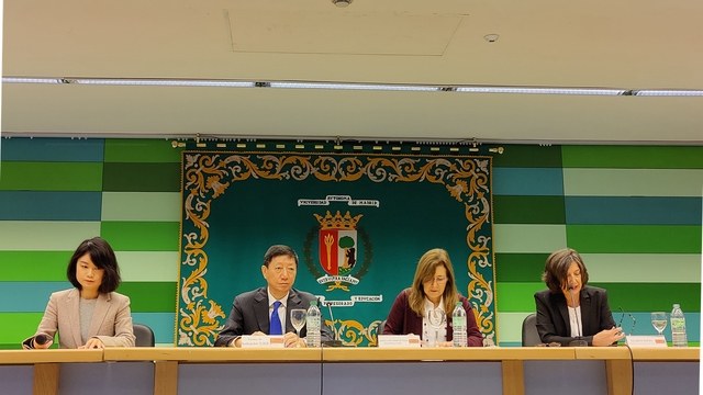 开幕式上,吴海涛大使肯定了马德里孔院自成立以来在开展中文教学、举办文化交流活动方面的重要作用,勉励马德里孔子学院继续为扩大两国人文交流、促进中西友好关系建设做出新的贡献。马德里自治大学校长阿玛娅∙门迪歌切(Amaya Mendikoetxea)回顾了马德里孔院成立以来,两校之间的友好交流与合作,对促进两校合作的中西双方表示感谢。上海外国语大学校长李岩松发来视频贺辞,祝贺马德里孔子学院成立15周年,并表示上海外国语大学将一如既往地支持孔院建设,祝愿马德里孔院在国际中文教育领域取得新的成就。