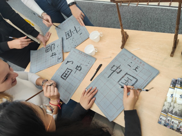 志愿者教师现场教授学生书写毛笔字,从执笔到运笔,由浅入深,使学生对汉字间架结构和对书法文化的内涵有所了解。参加体验活动的学生表示希望报名孔院的中文课程,更希望未来有机会去中国深造,感受中华文化魅力。