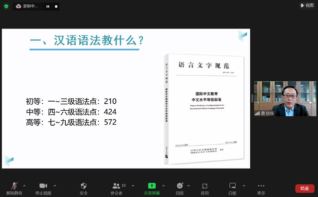 第二场讲座鹿教授则从汉语语法教学方面由浅入深地讲解了“语法教什么?”和“怎么教?”,重点介绍了在课堂中语法讲解原则和操练原则,结合具体的语法教学示例直观地展示了怎么更高效地教语法。最后,鹿老师还向大家分享了中文教学书籍和网络学习资源。鹿老师从理论到运用,在短短两小时中系统地梳理了语法教学原则,为孔院的新老教师搭建和巩固语法框架。