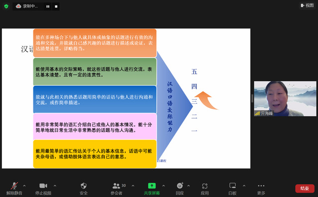 第一场讲座亓教授从口语能力、如何评价、如何互动、常见问题讨论和分享四个方面,向老师们展示了口语能力评估的形式、教师在口语教学中扮演的角色、口语活动设计的原则以及常见的口语互动教学活动等内容。海外中文学习者因缺少语言环境,口语一直是教学中的难点,通过本次培训教师们从最常见的问答练习到如何设计互动口语练习都有了更系统、深入的认识。