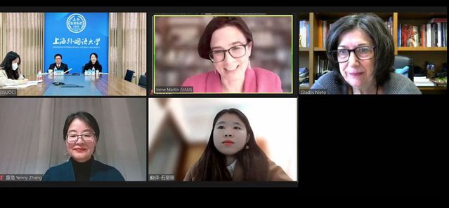 上海外国语大学校长李岩松、马德里自治大学副校长伊莱尔·马丁·科尔特斯(Irene Martín Cortés)、上外孔子学院工作处处长冯辉、马德里孔院外方院长孙歌迪 (Gladys Nieto)、中方院长章艳出席线上理事会。会议由冯辉处长主持。